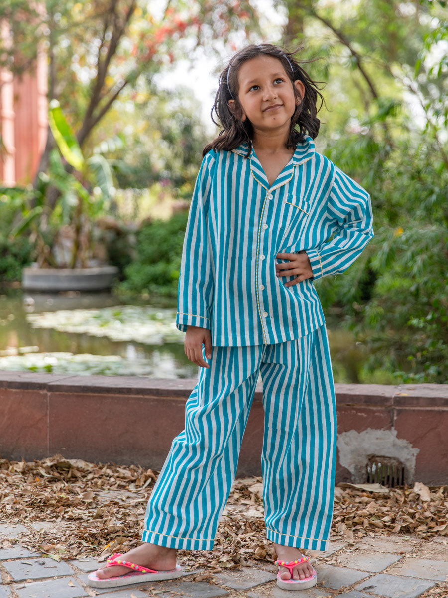 Turquoise Stripes Block Printed Cotton Top & Pyjama Set