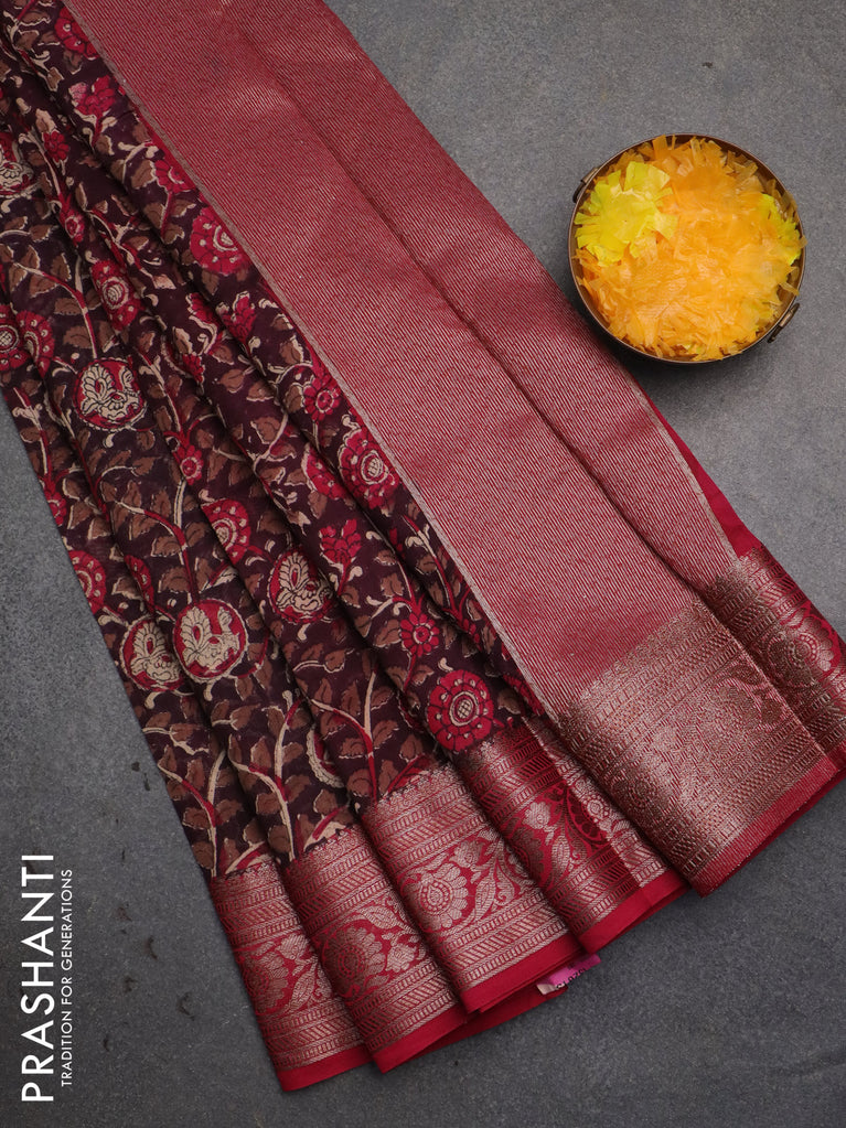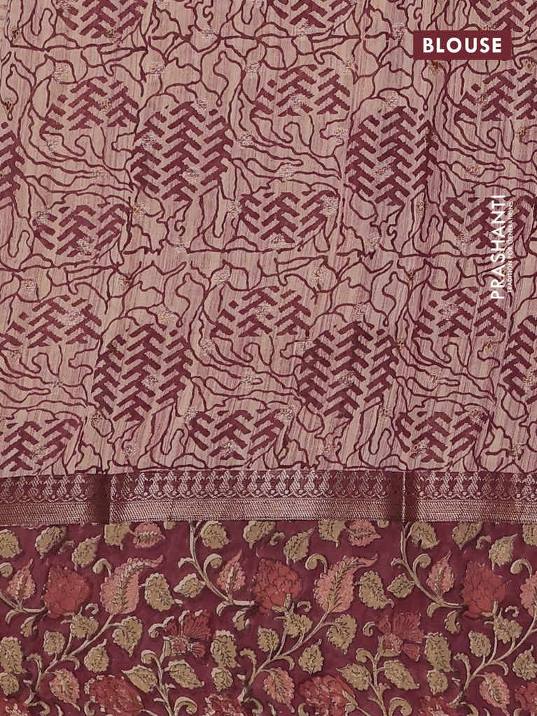 Chanderi silk cotton saree wine shade and pink with allover kalamkari prints and banarsi style border