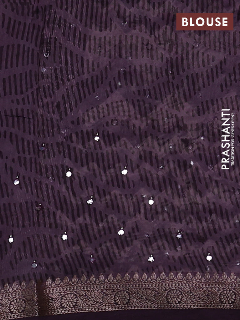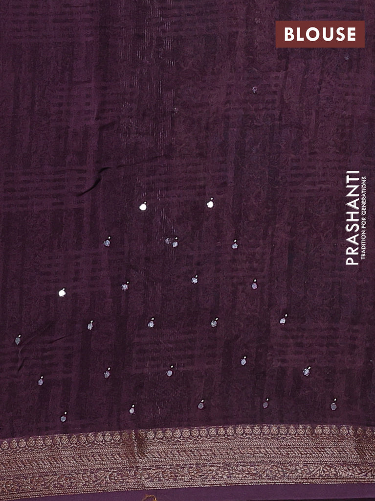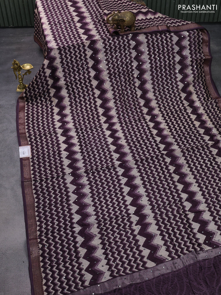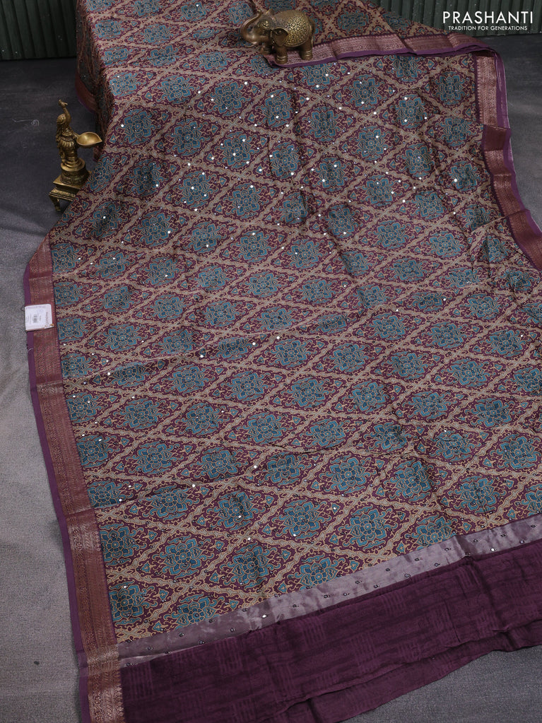 Chanderi silk cotton saree wine shade and beige with allover zig zag prints & mirror work and woven border