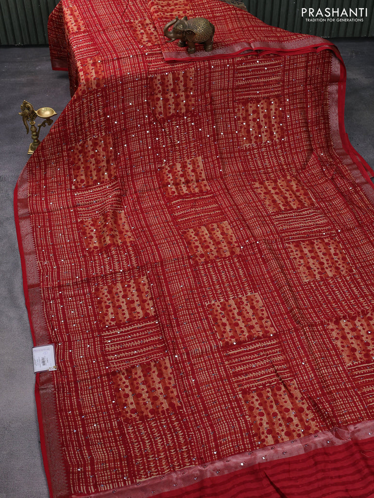 Chanderi silk cotton saree rustic orange and red with allover geometric prints & mirror work and woven border