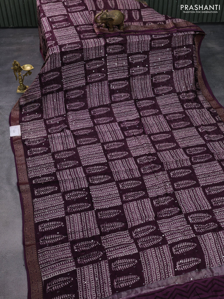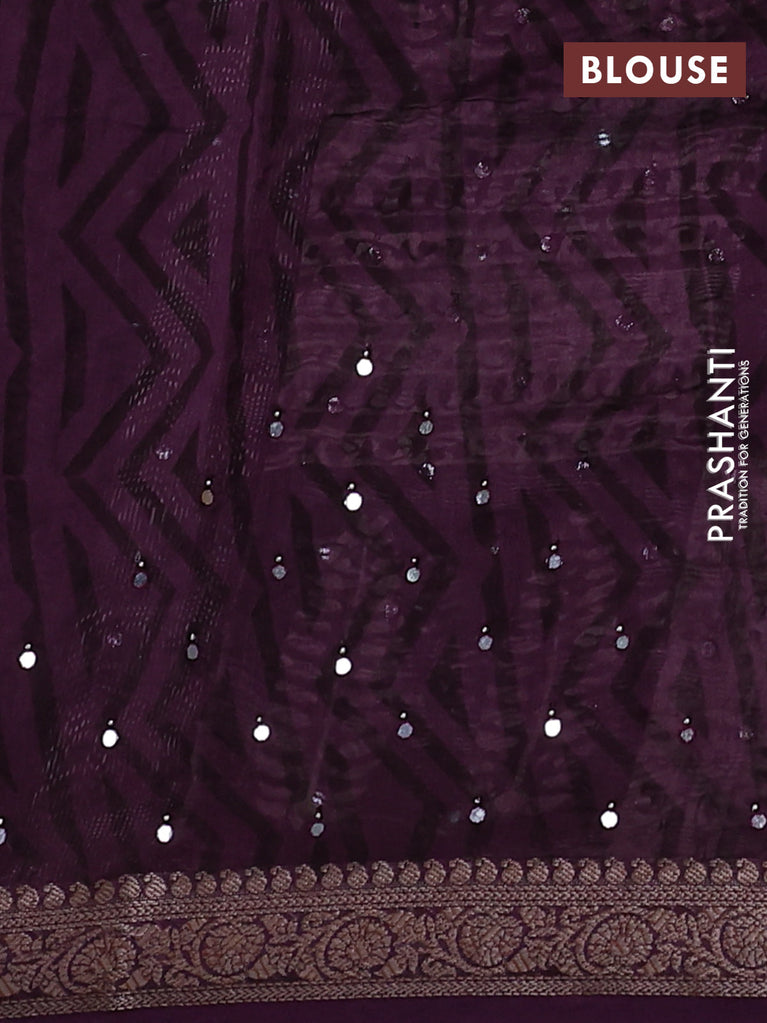 Chanderi silk cotton saree wine shade with allover prints & mirror work and woven border