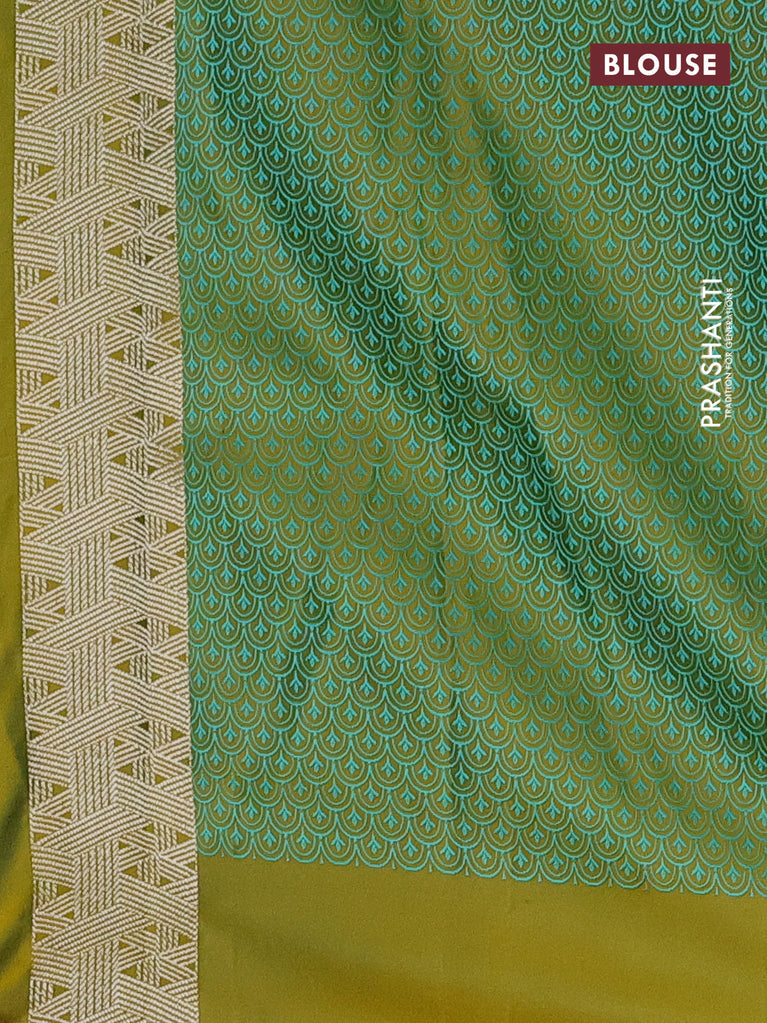 Banarasi semi mushru silk saree dual shade of mustard and teal green shade with allover self emboss and zari woven border