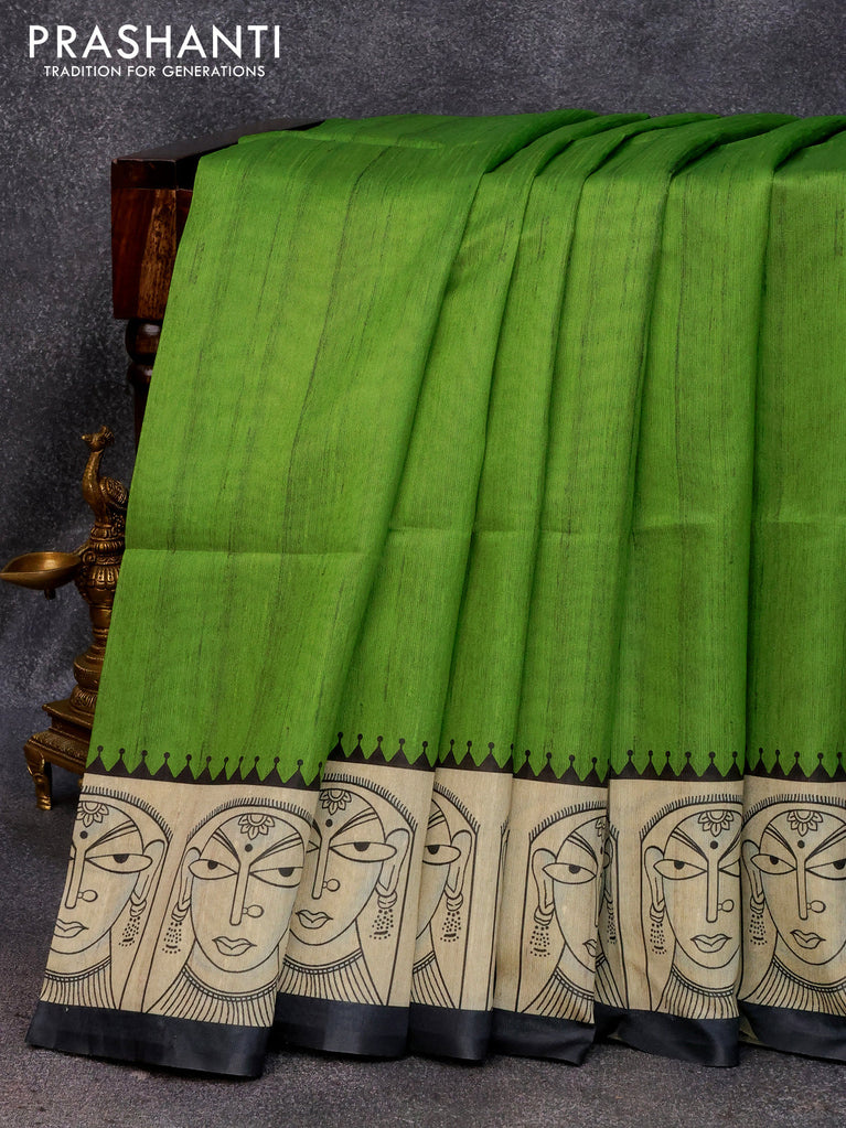 Chappa saree light green and black with allover small zari checked pattern & floral digital prints and ganga jamuna border