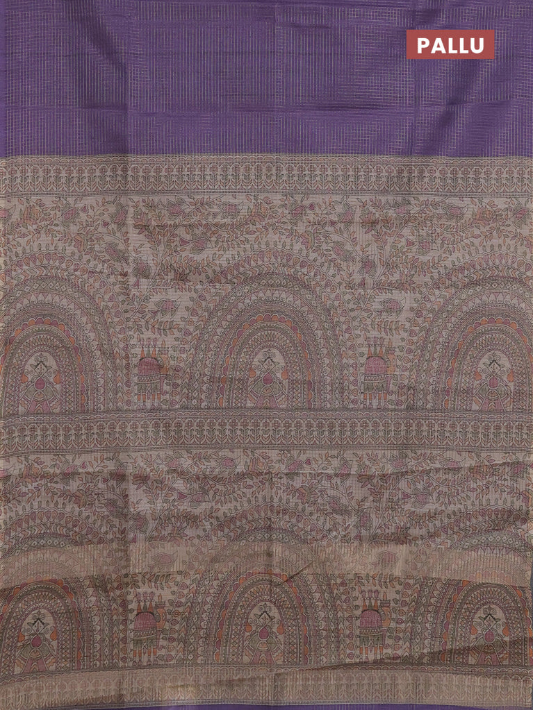 Chappa saree violet and beige with allover small zari checked pattern and madhubani printed pallu