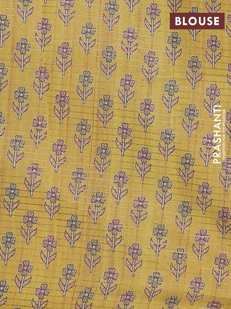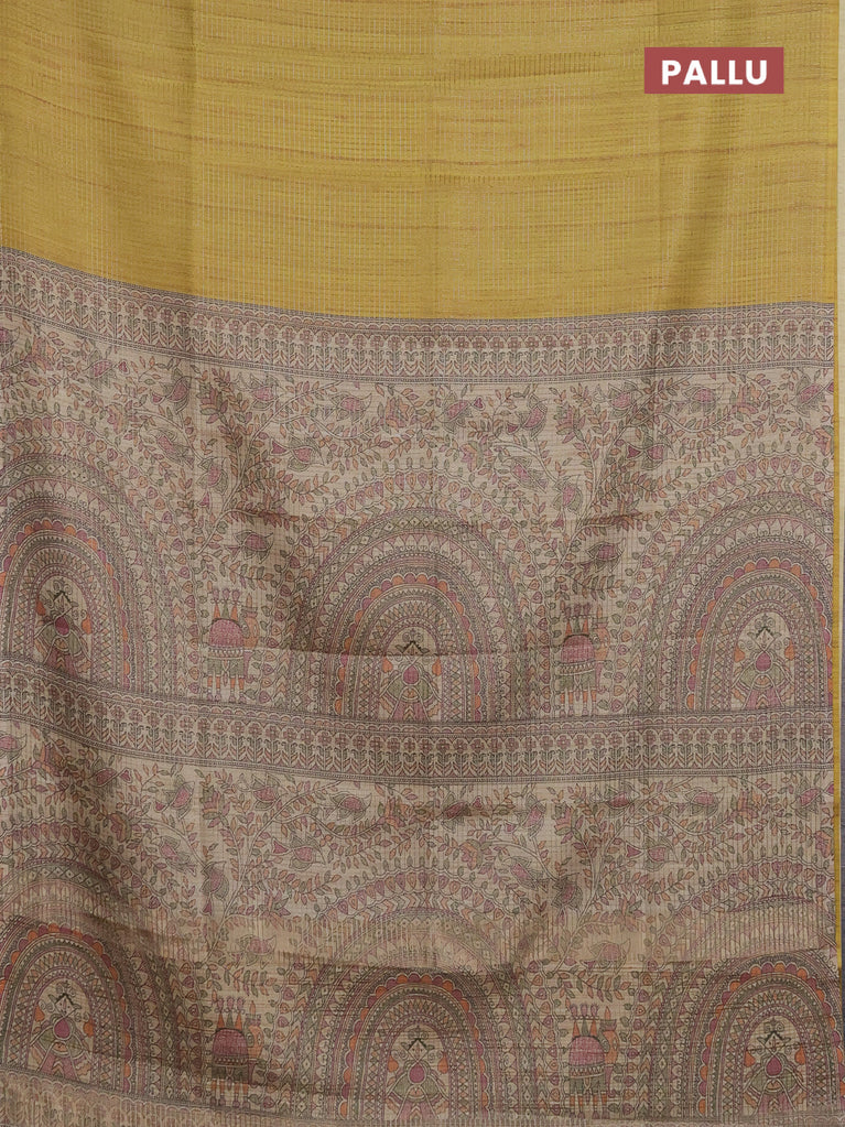 Chappa saree yellow and beige with allover small zari checked pattern and madhubani printed pallu