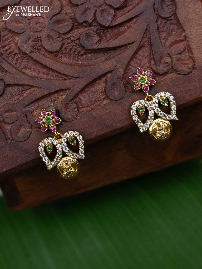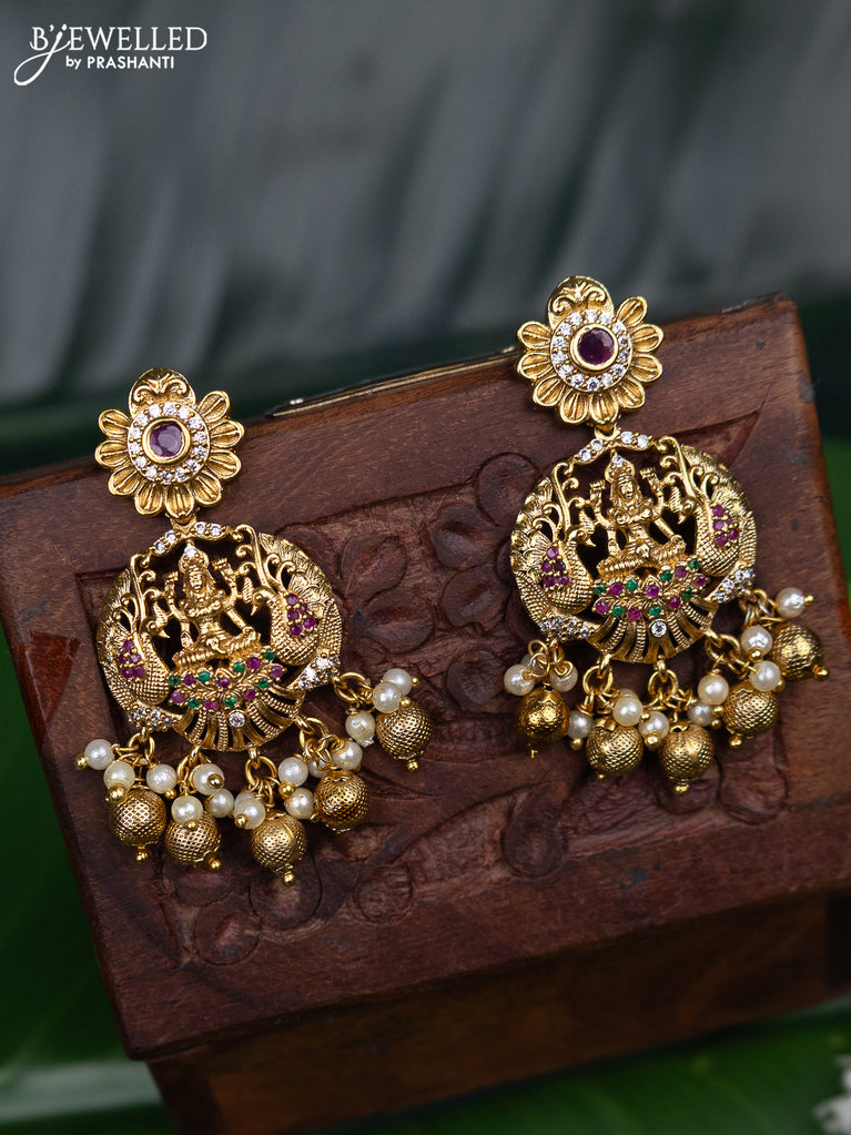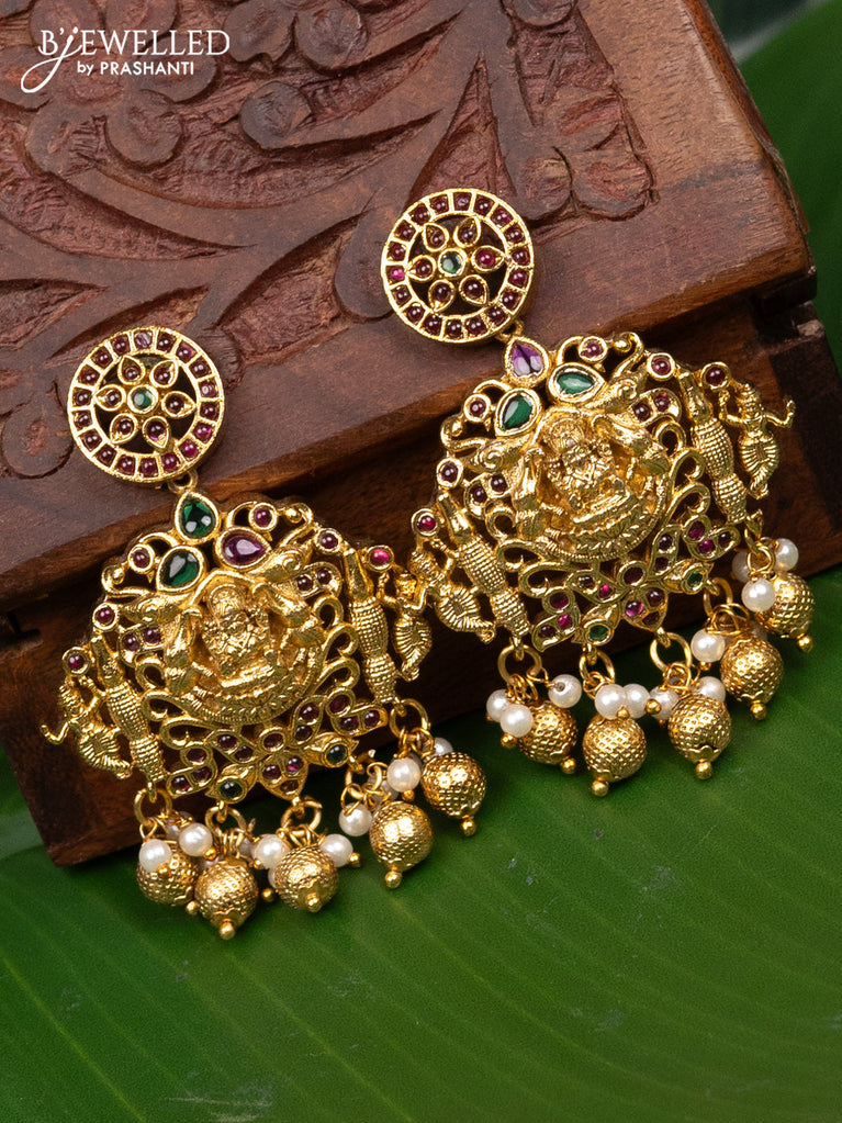 Antique earring lakshmi design with kemp & cz stones and pearl & golden beads hanging
