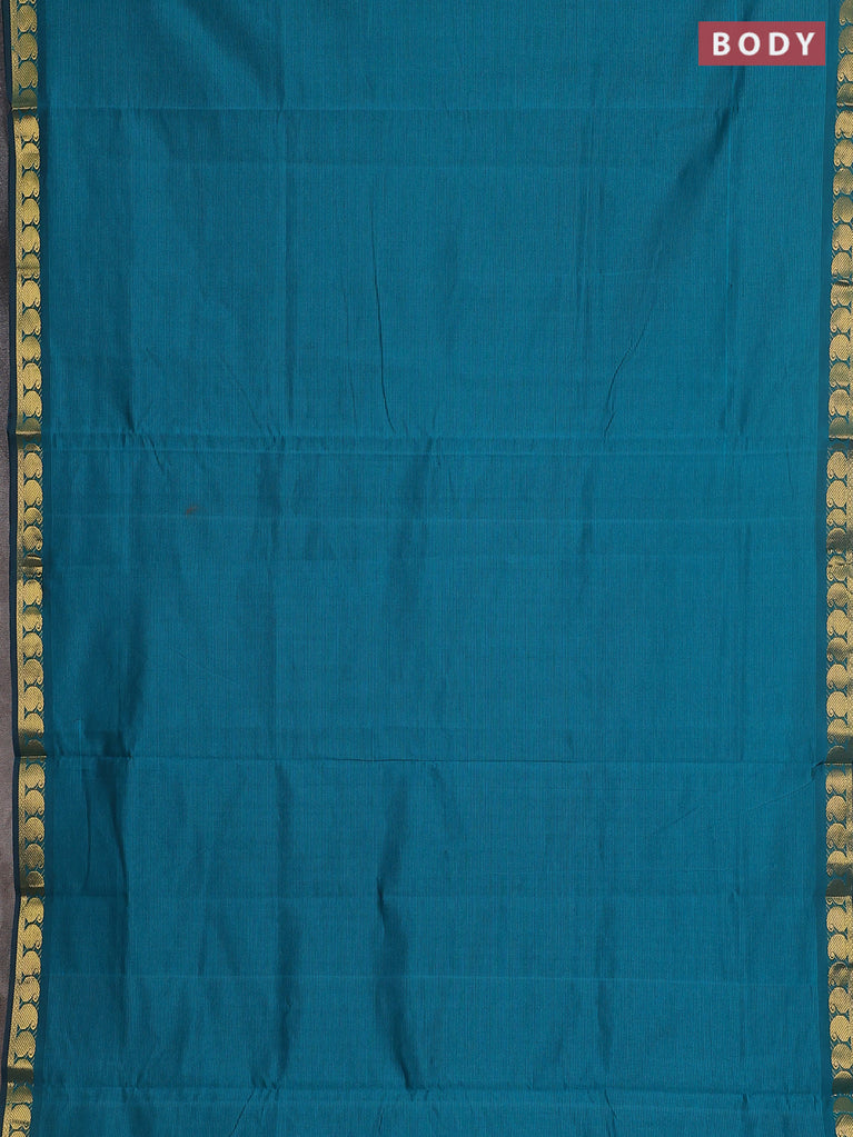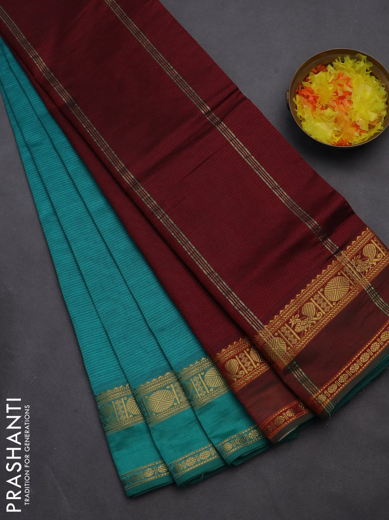 10 yards Poly cotton saree teal green and maroon with plain body and rettapet zari woven border