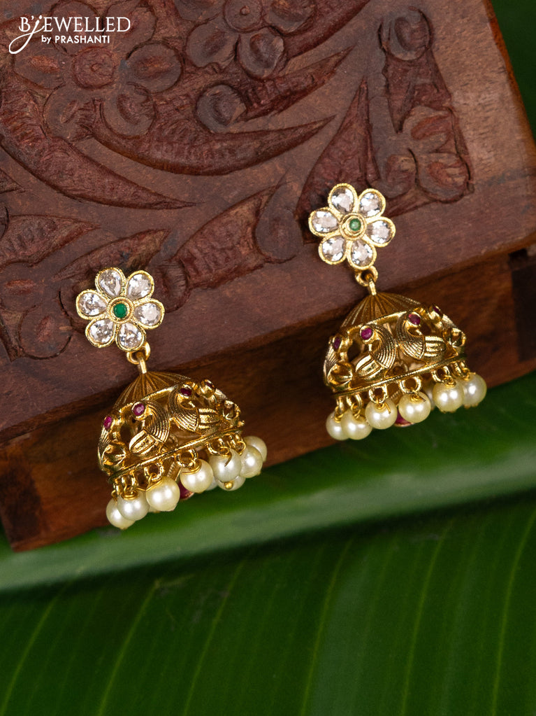 Antique jhumka peacock design with kemp & cz stones and pearl hanging