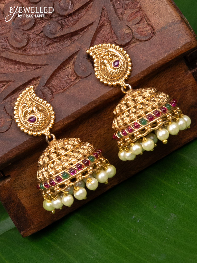Antique jhumka peacock design with kemp stones and pearl hangings