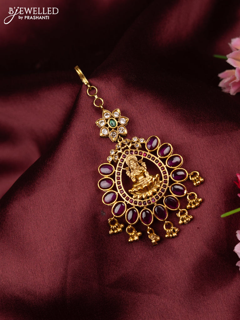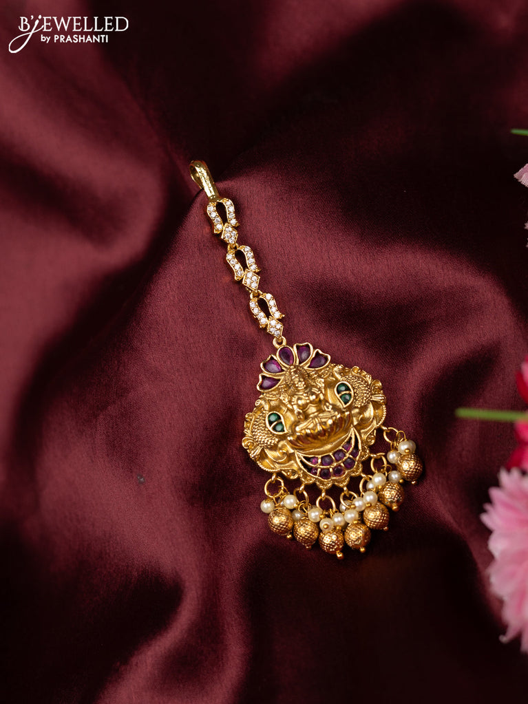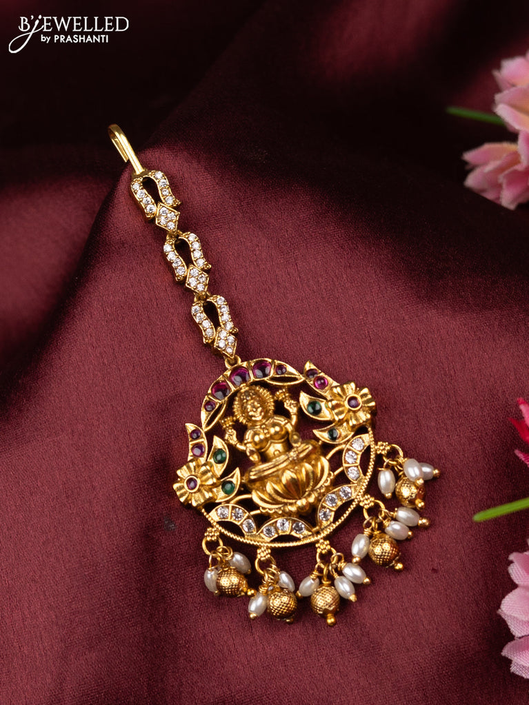 Antique maang tikka lakshmi design with kemp & cz stones and pearl hangings