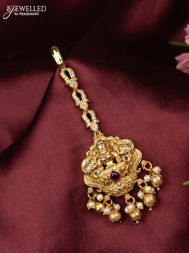 Antique maang tikka lakshmi design with kemp & cz stone and pearl hangings