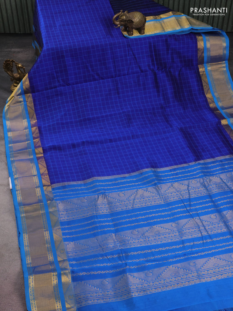 10 yards silk cotton saree blue and cs blue with allover checked pattern and zari woven border