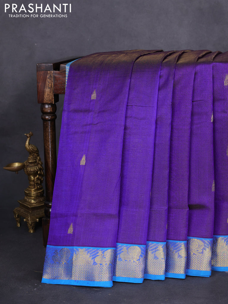 10 yards silk cotton saree blue and maroon with allover vairaosi pattern & zari buttas and zari woven border