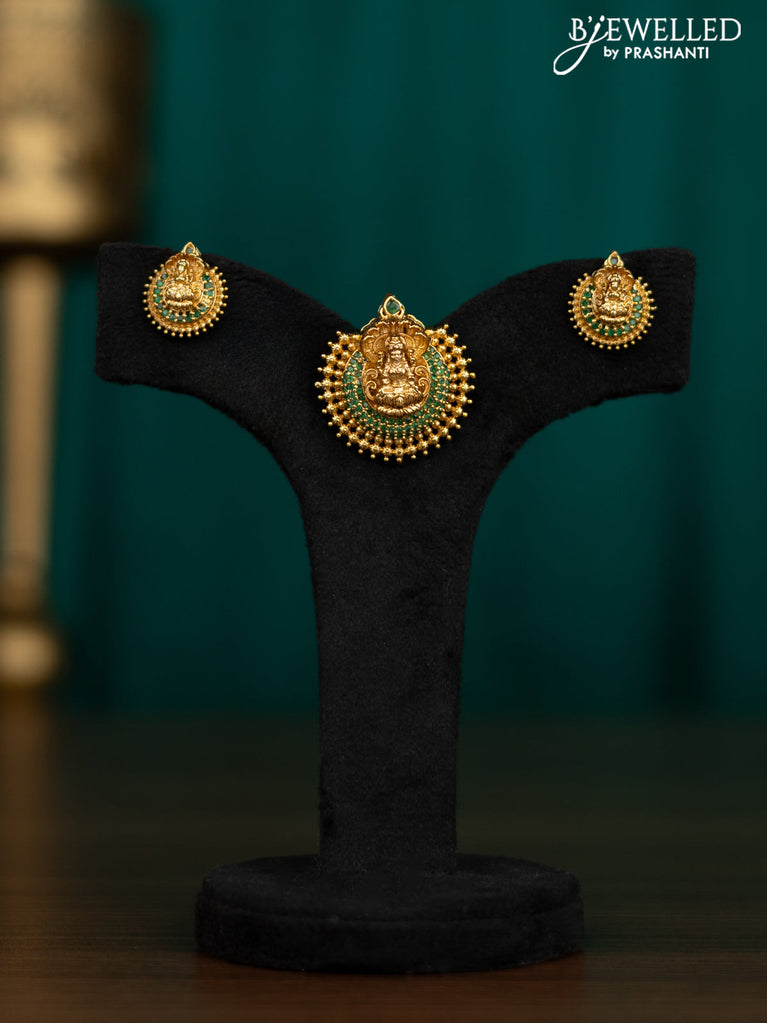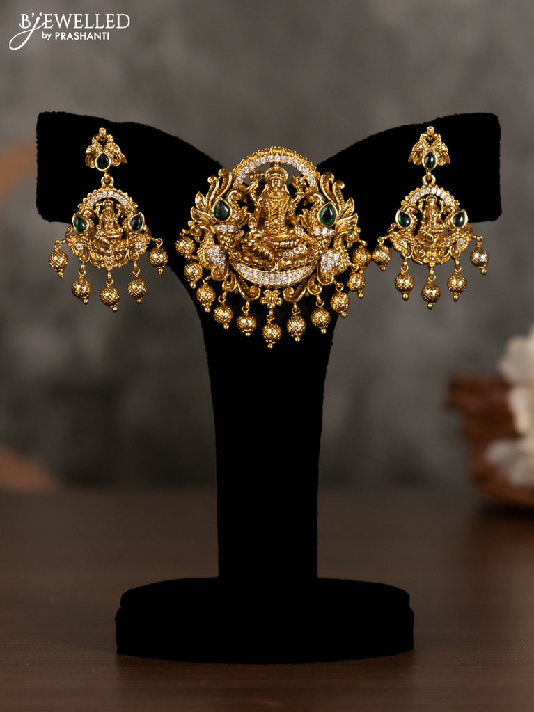 Antique pendant set lakshmi design with green kemp & cz stones and golden beads hanging