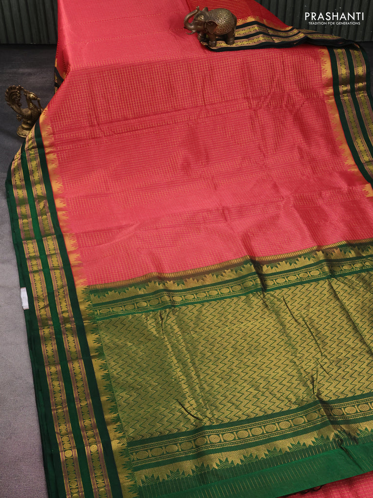 10 yards silk cotton saree peach pink and green with allover small zari checks and zari woven border
