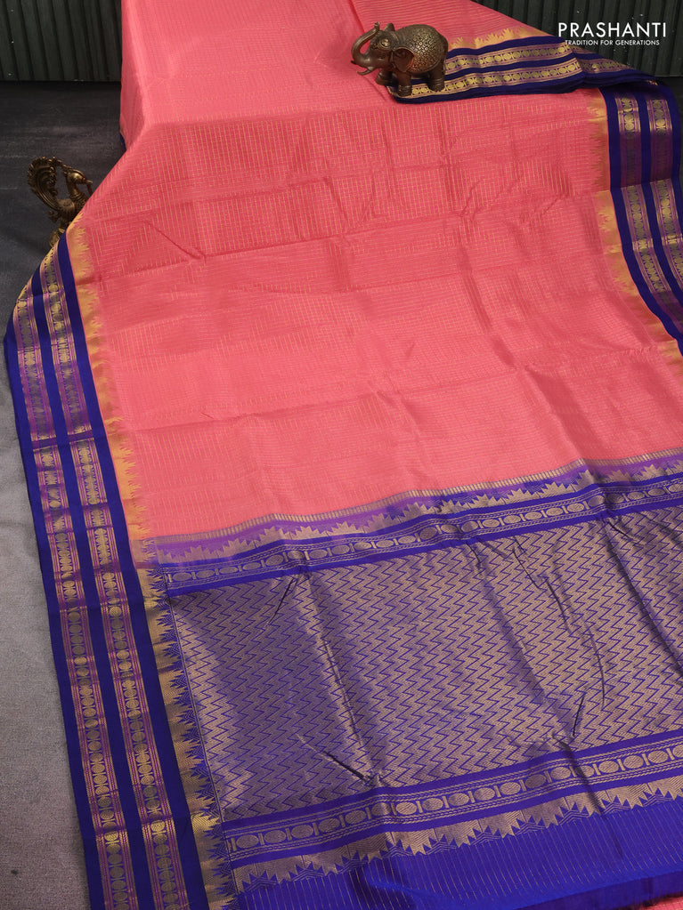 10 yards silk cotton saree peach shade and blue with allover small zari checks and zari woven border