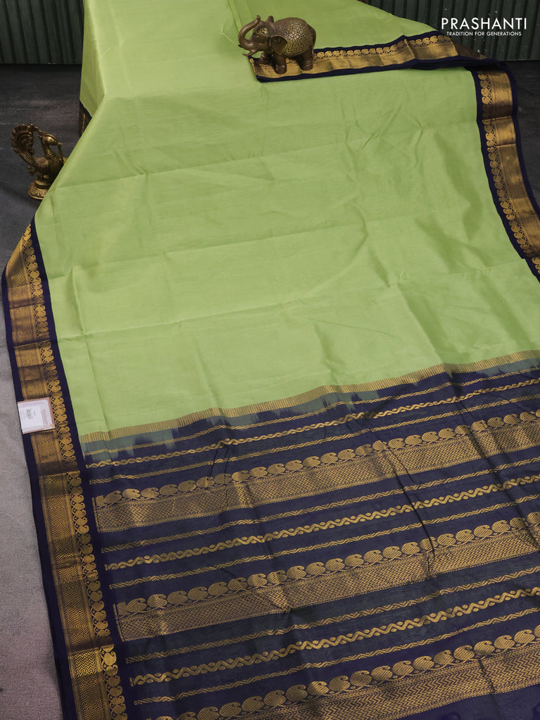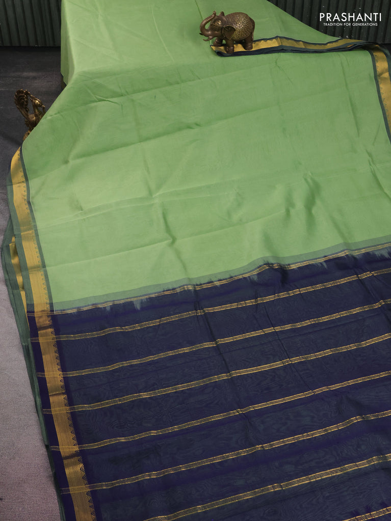 10 yards silk cotton saree pista green and navy blue with plain body and zari woven border
