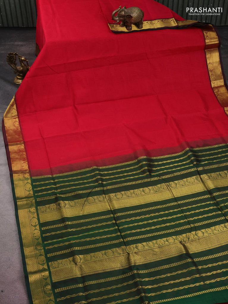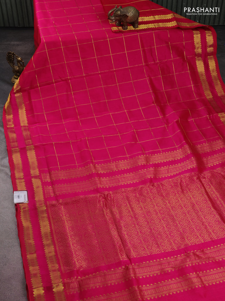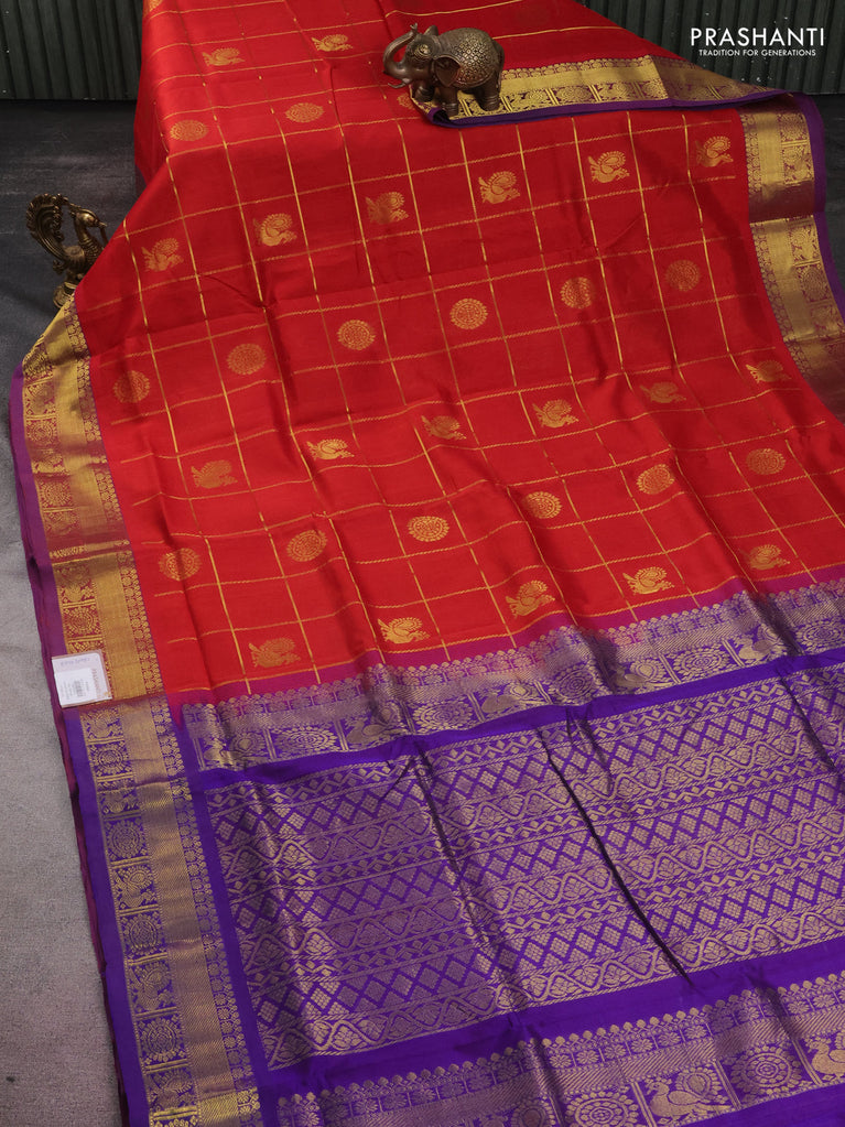 10 yards silk cotton saree red and violet with allover zari checks & annam mayil chakkaram buttas and zari woven border