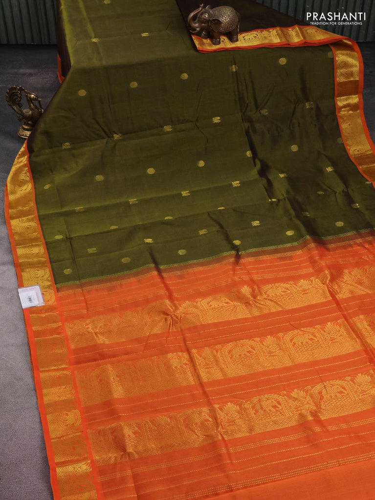 10 yards silk cotton saree sap green and orange with annam & rudhraksha zari woven buttas and zari woven border