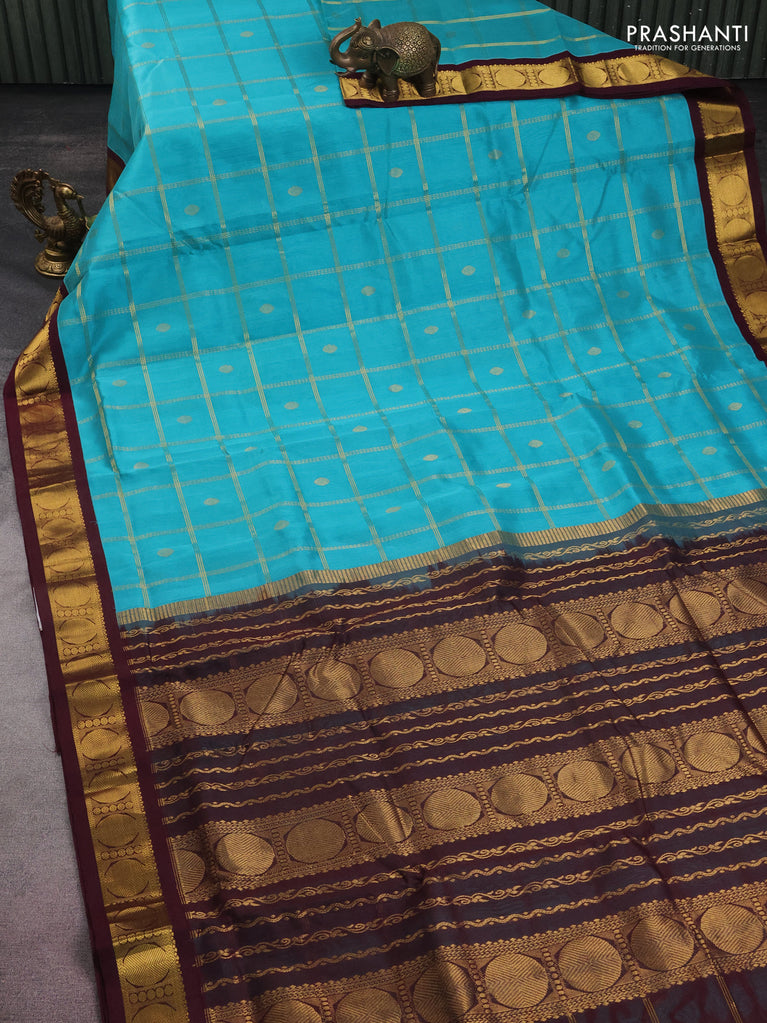 10 yards silk cotton saree teal blue and brown with allover zari checks & rudhraksha buttas and zari woven border