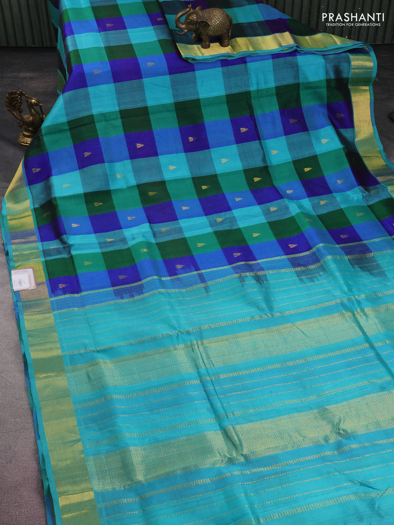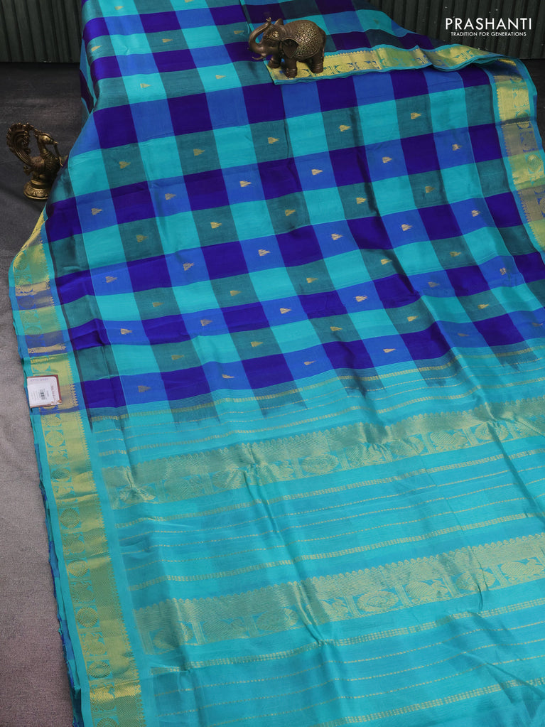10 yards silk cotton saree teal blue and blue with allover paalum pazhamum checks & buttas and zari woven border