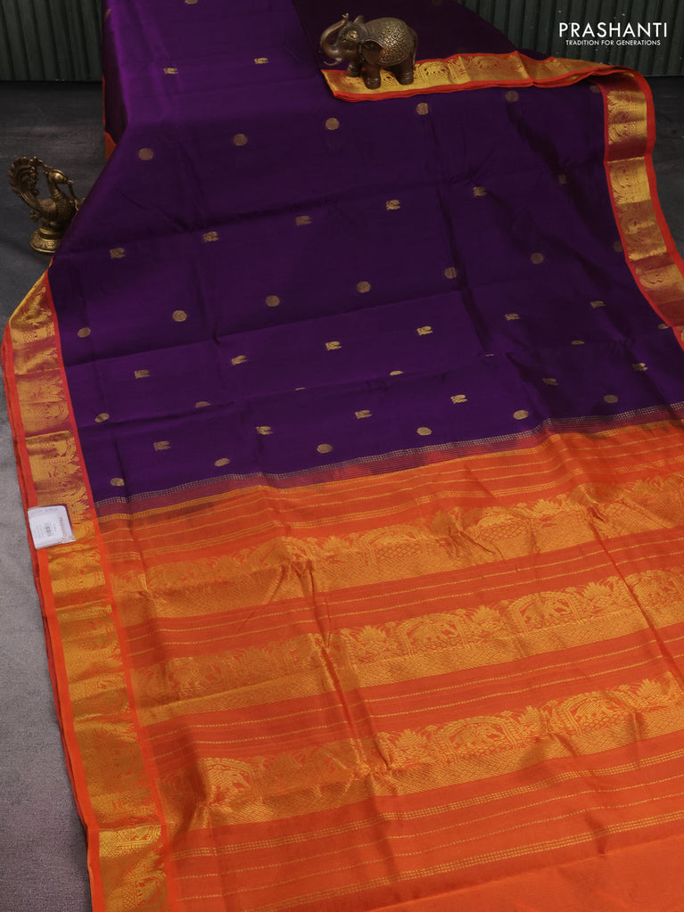 10 yards silk cotton saree violet and orange with annam & rudhraksha zari woven buttas and zari woven border