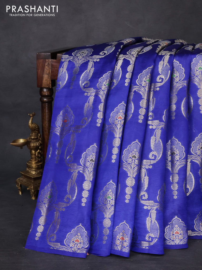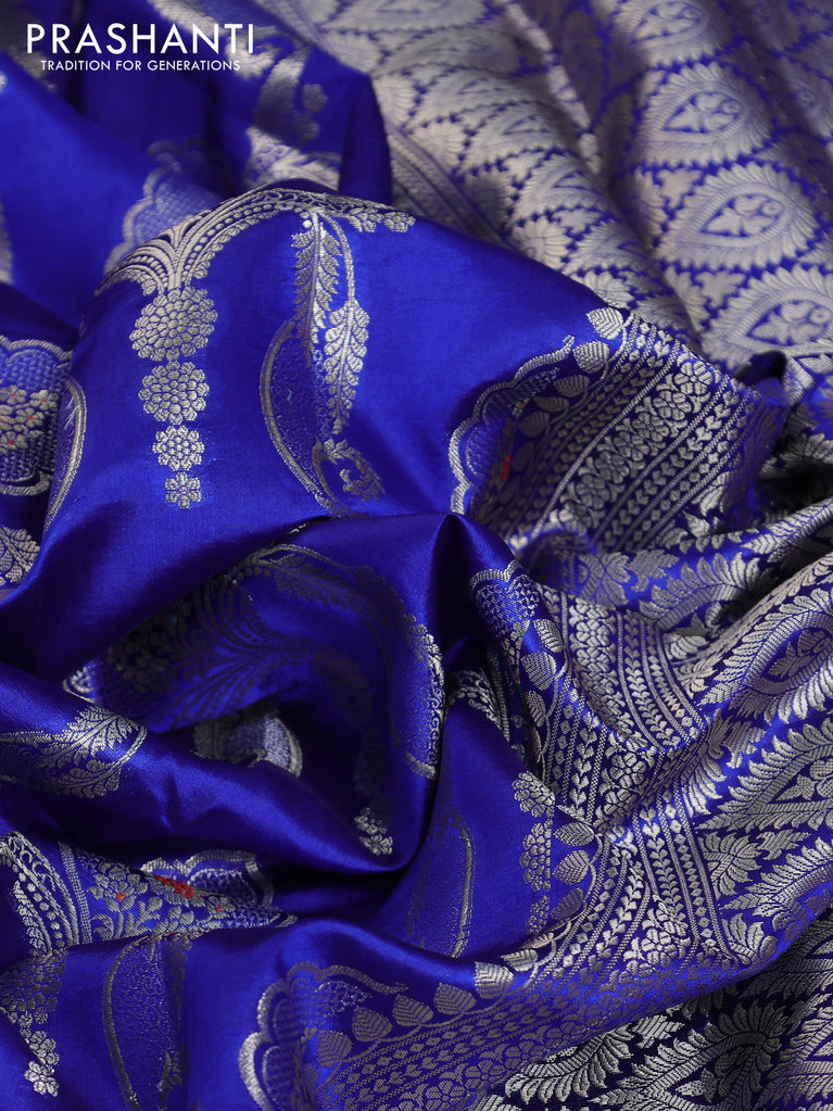 Banarasi poona silk saree blue and mango yellow with allover zari weaves in borderless style