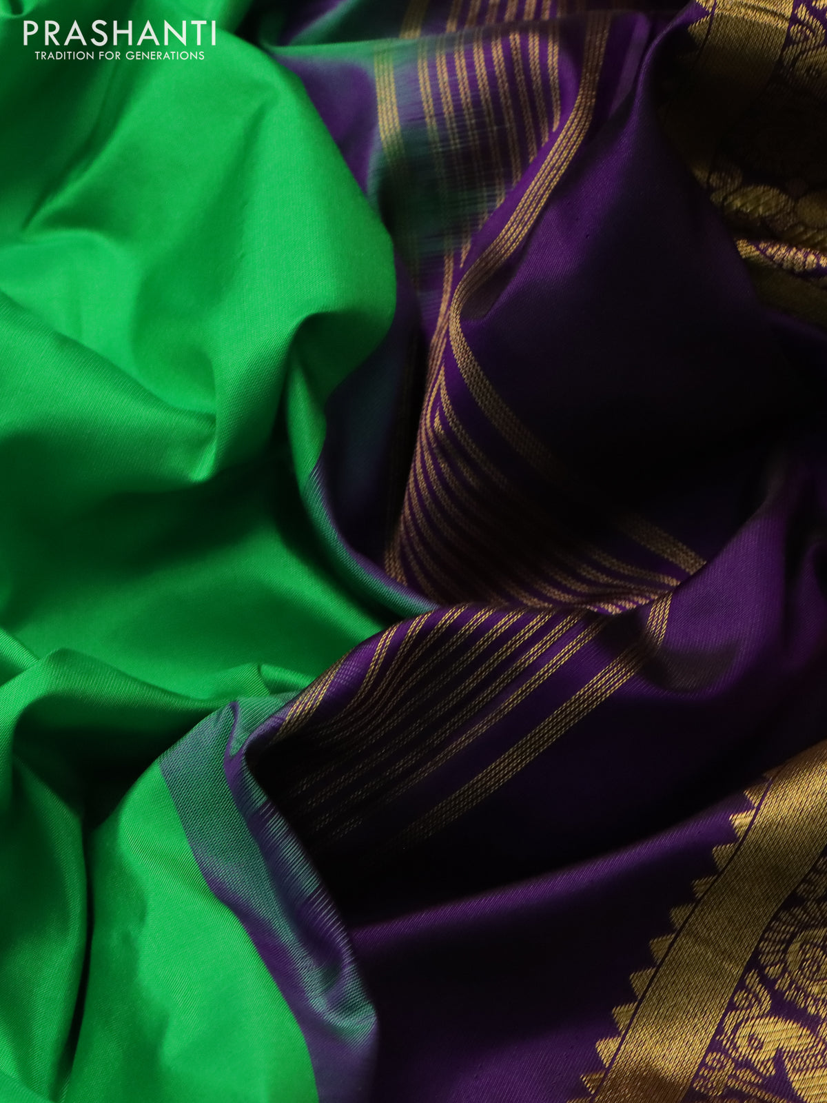 10 yards silk saree green and deep violet with plain body and temple design zari woven border