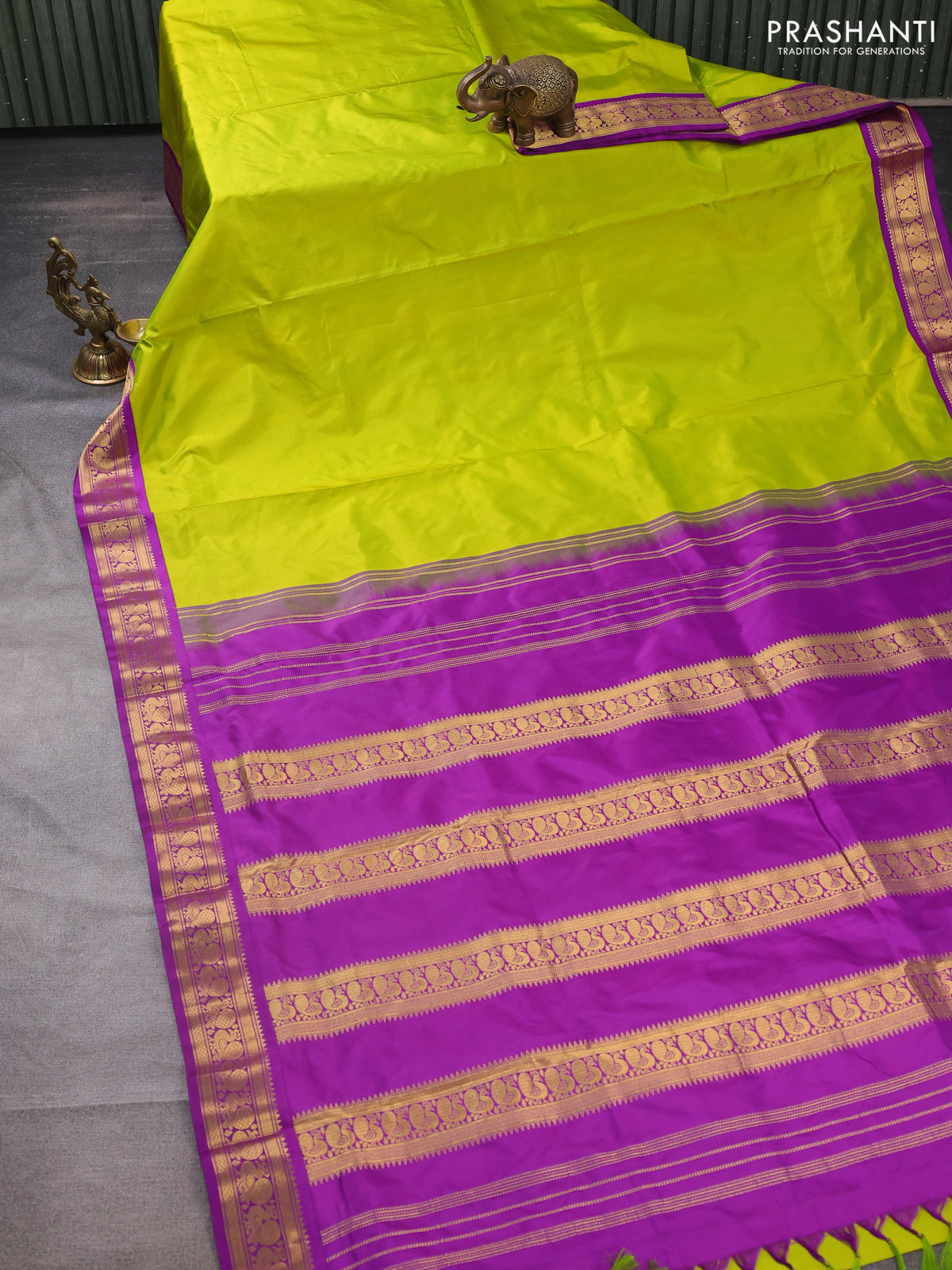 10 yards silk saree lime green and purple with plain body and zari woven korvai border