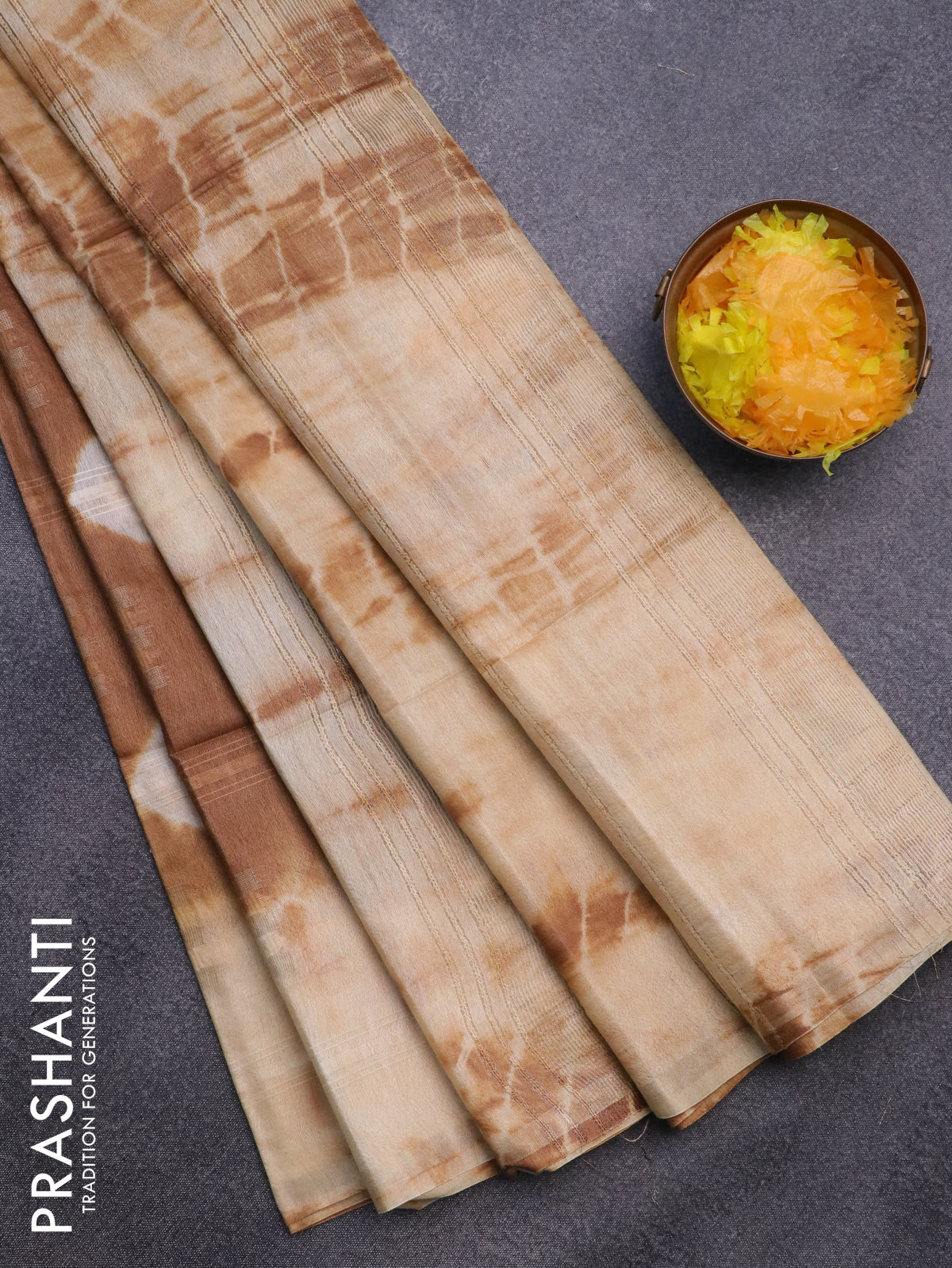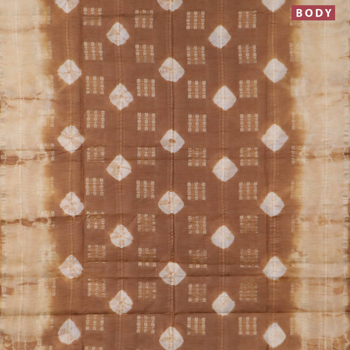 Bamboo saree brown and cream with allover zari woven buttas & batik prints and small zari woven border