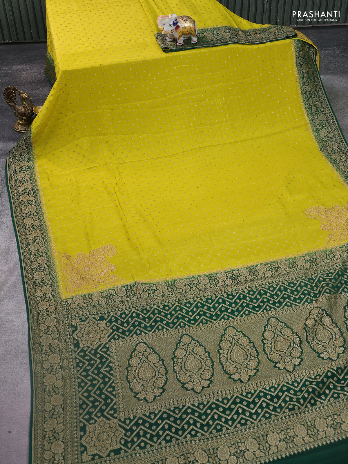 Banarasi crepe saree lime yellow and green with woven buttas and woven border