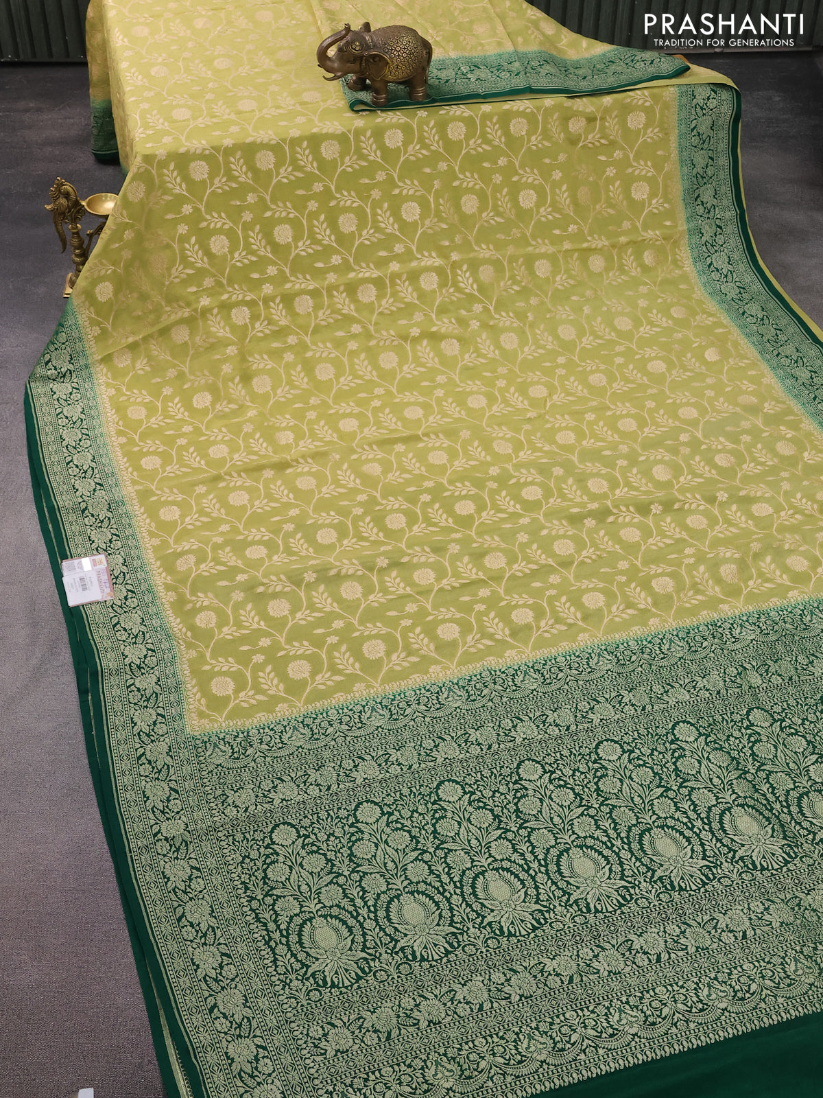 Banarasi crepe saree pista green and green with allover thread & zari weaves and woven border