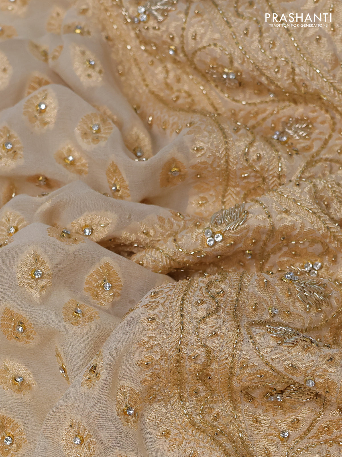 Banarasi georgette saree cream with woven buttas & stone work and zardosi work border