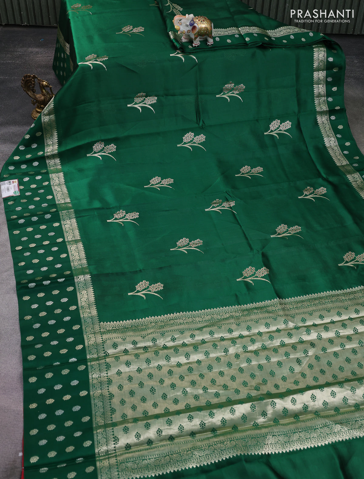Banarasi poona silk saree green and red with zari woven floral buttas and zari woven butta border