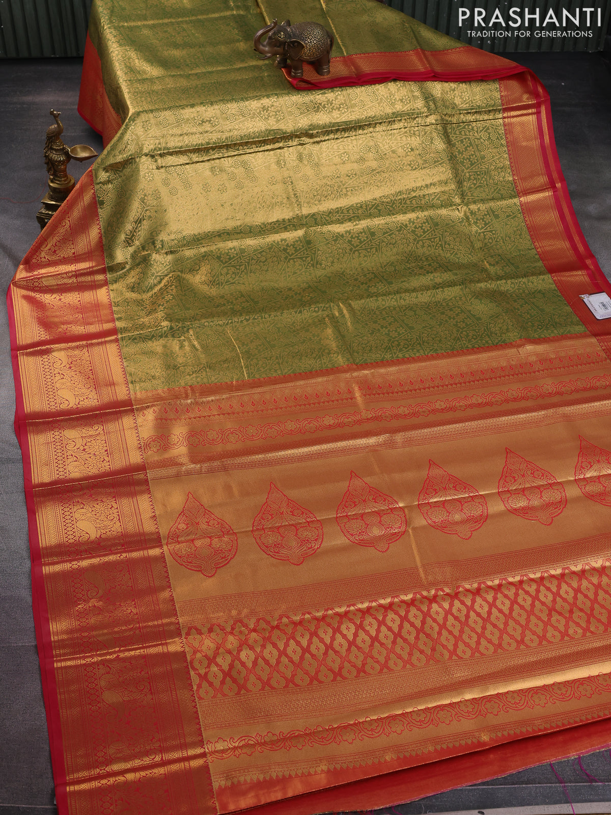 Bangalori tissue silk saree dual shade of mehendi green and reddish pink with allover zari woven brocade weaves and long zari woven border