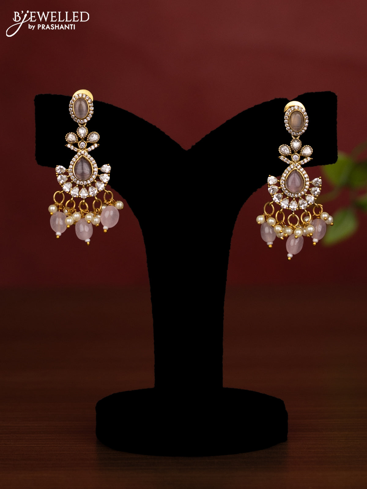 Beaded triple layer baby pink necklace peacock design with kundan & cz stones and pearl & beads hanging in victorian finish