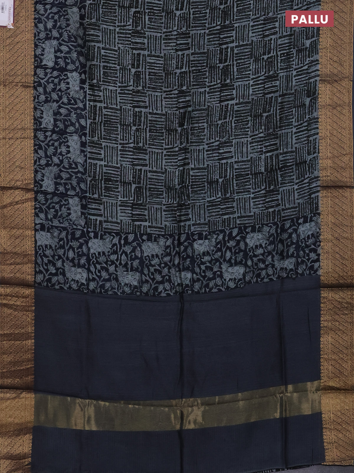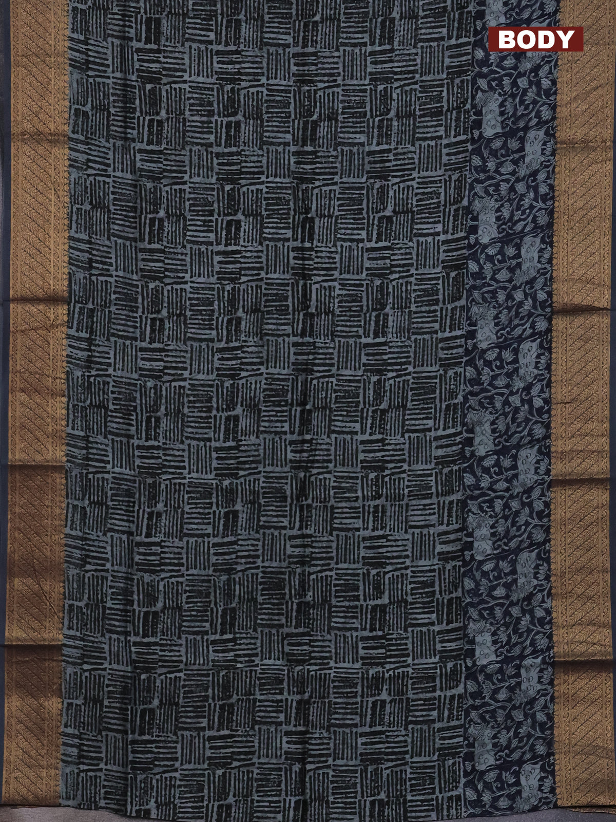 Chanderi silk cotton saree drak navy blue and grey with allover geometric prints and pichwai printed banarasi style border