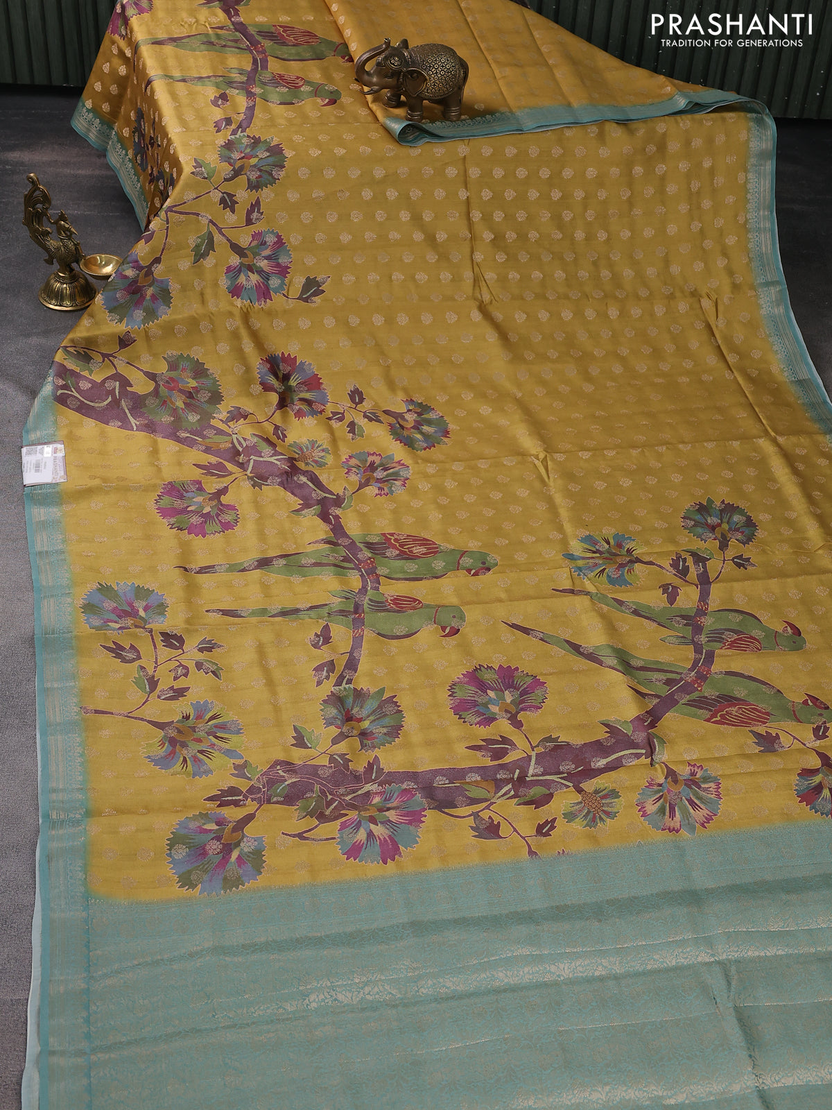 Chiniya silk saree mustard yellow and teal shade with woven buttas & digital prints and zari woven border