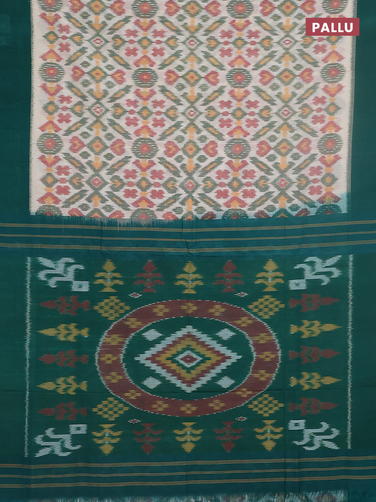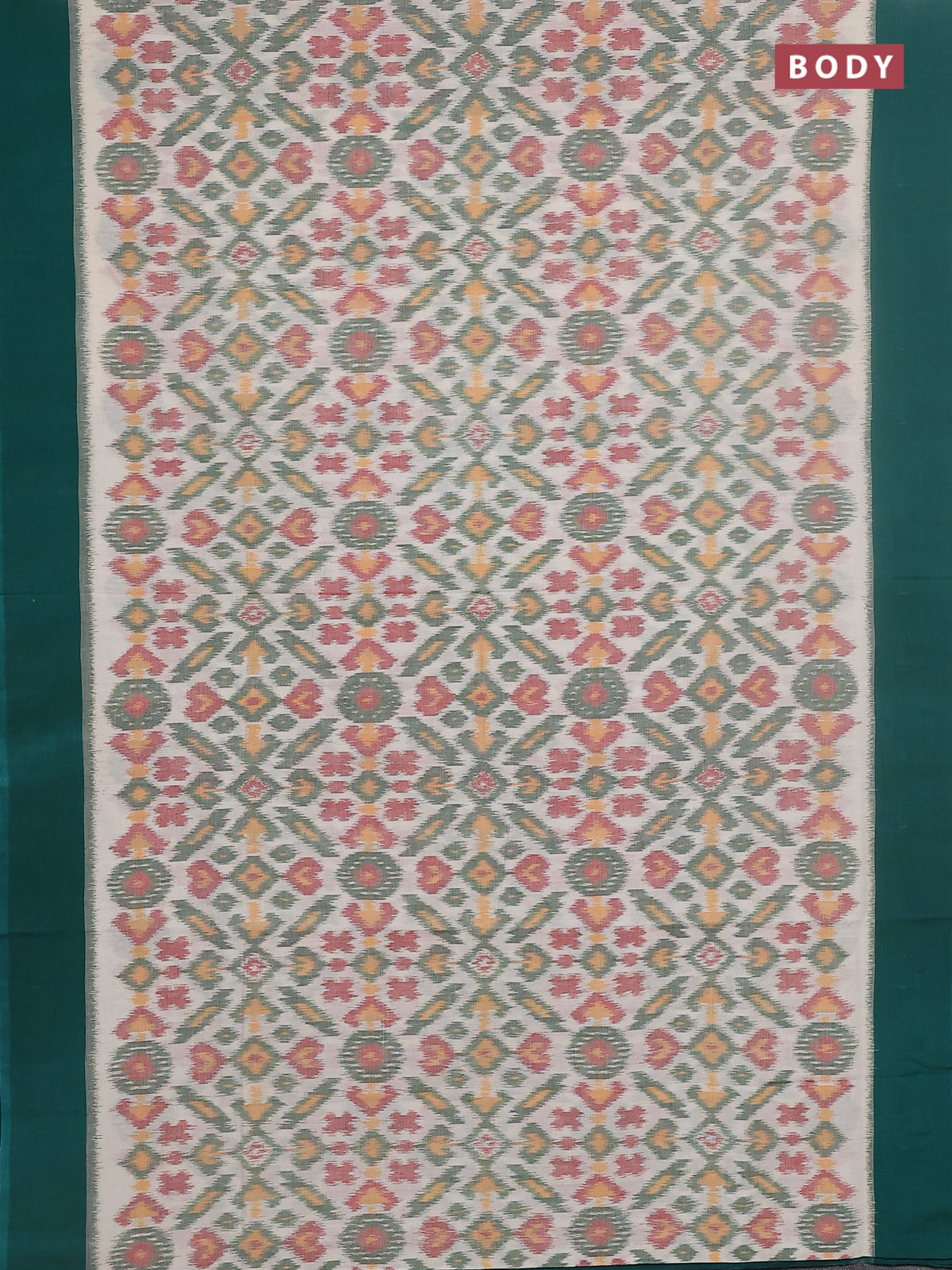 Ikat cotton saree cream and teal green with allover ikat weaves and simple border