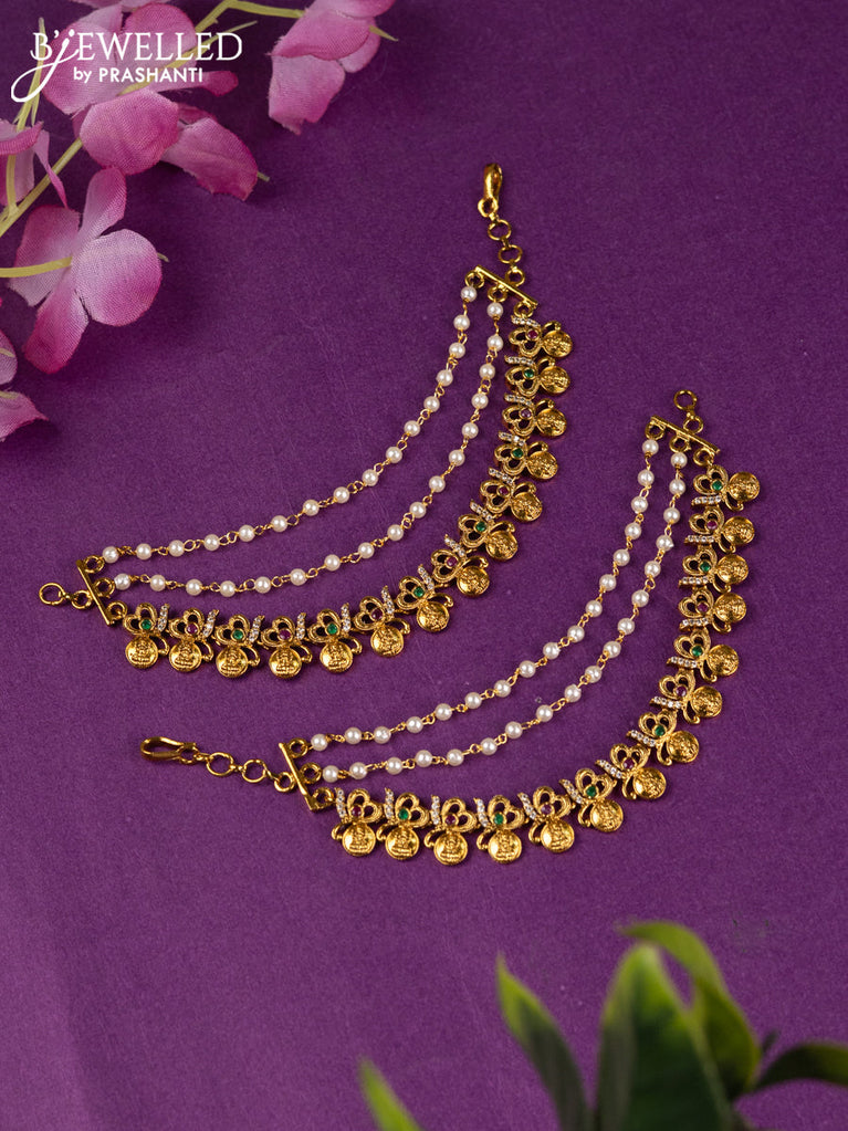 Antique triple layer maatal shanku design with kemp & cz stones and pearl hangings