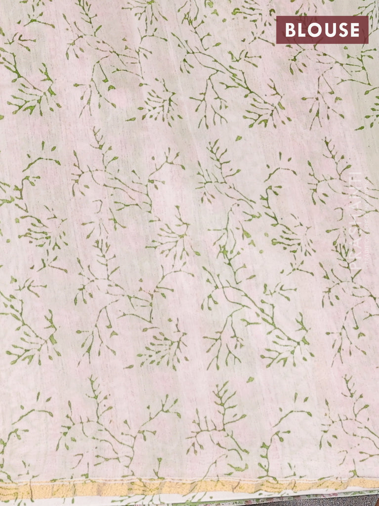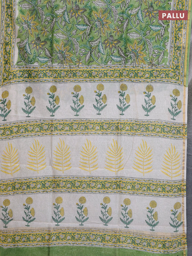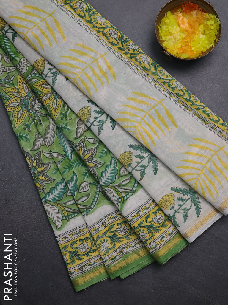 Chanderi silk cotton saree beige and green with allover prints and banarasi style border