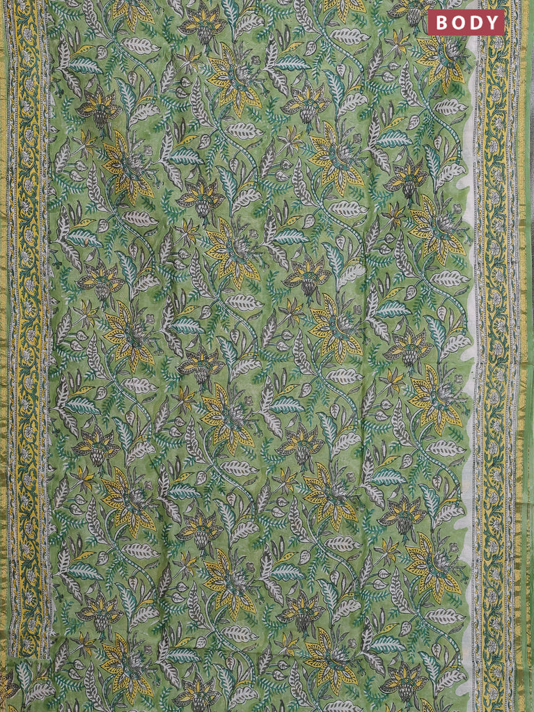 Chanderi bagru saree pista green with allover kalamkari prints and small zari woven border