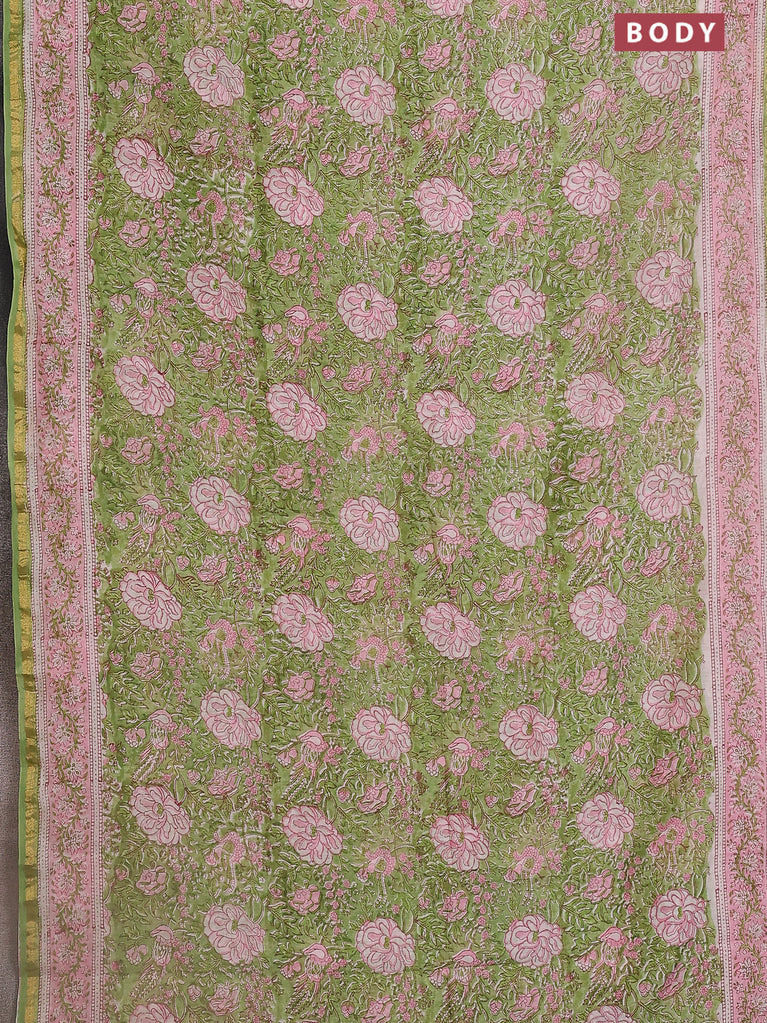 Chanderi bagru saree pista green and light pink with allover kalamkari prints and small zari woven border