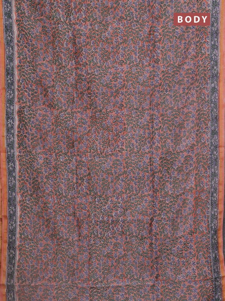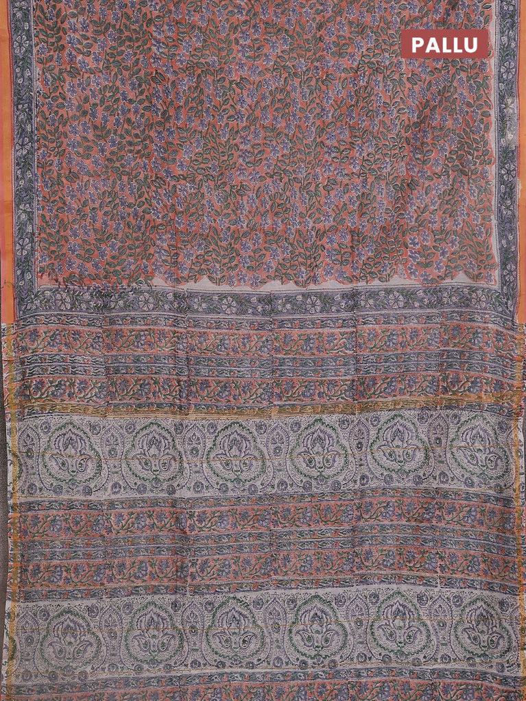 Chanderi bagru saree peach shade with allover floral prints and small zari woven border