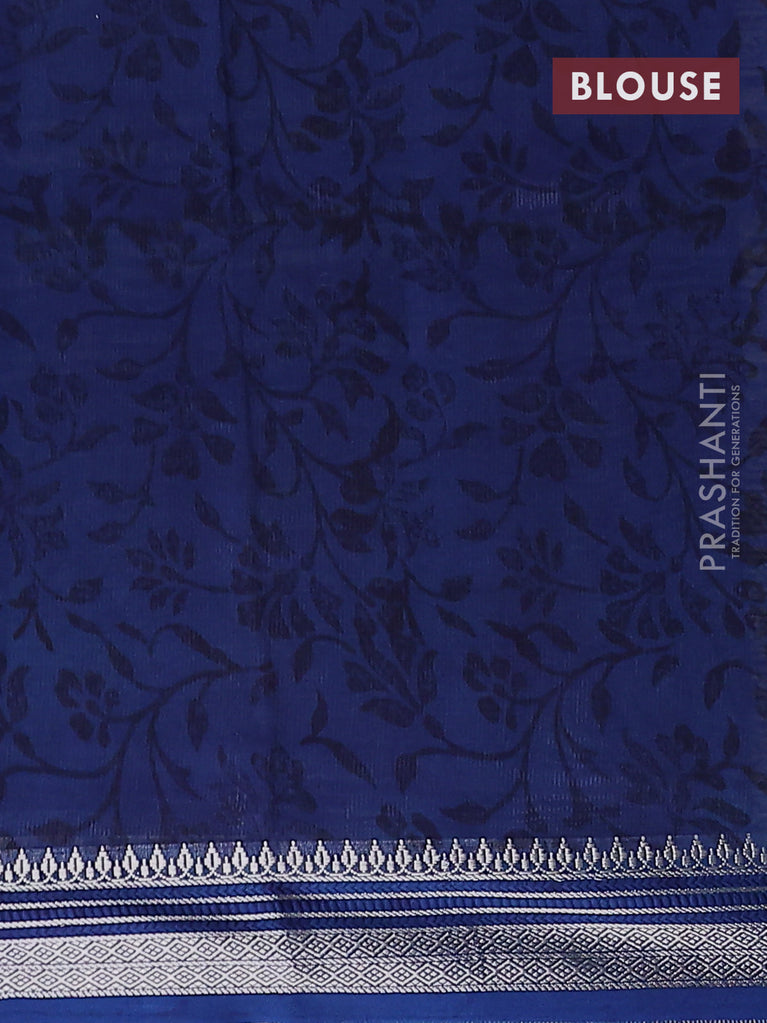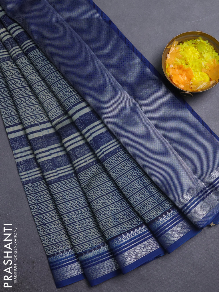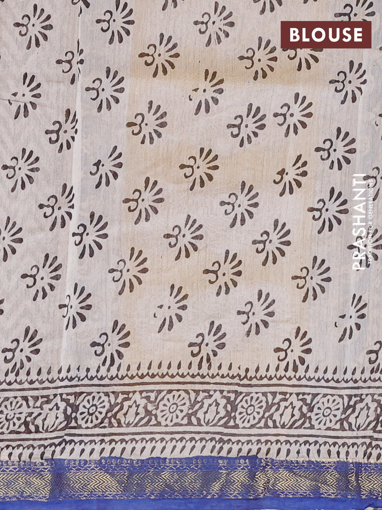 Chanderi silk cotton saree beige and blue with allover prints and silver zari woven border