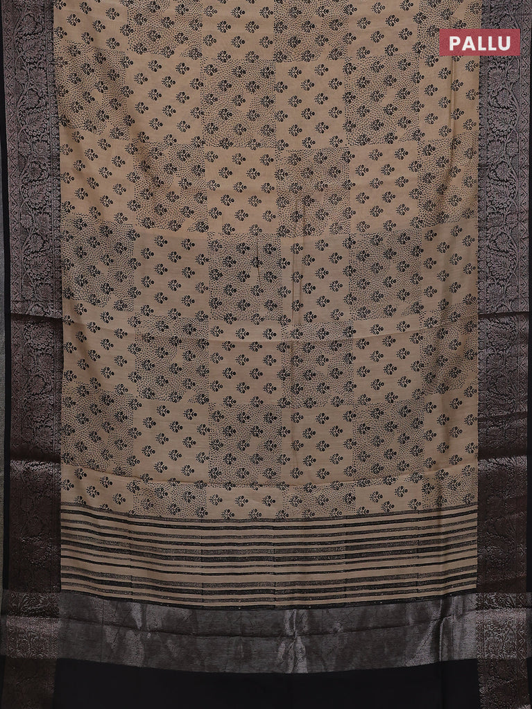Chanderi silk cotton saree beige and black with allover prints and banarasi style border
