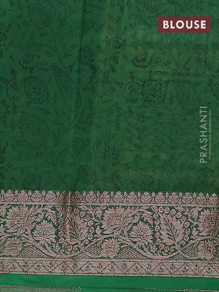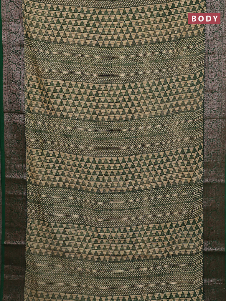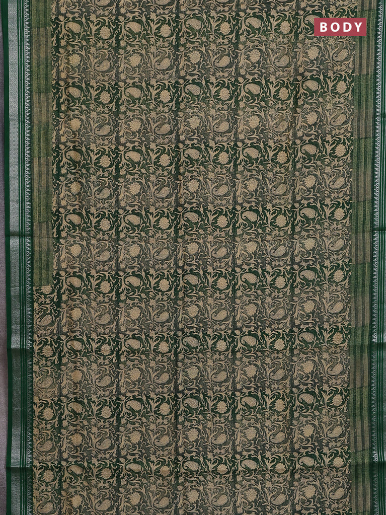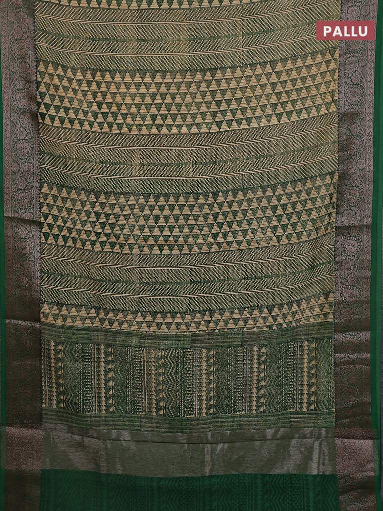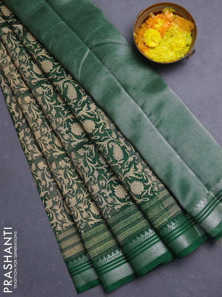 Chanderi silk cotton saree beige and bottle green with allover prints and silver zari woven border