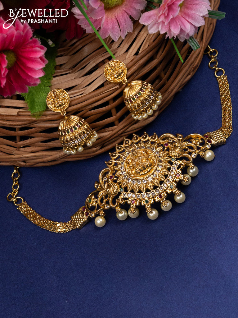 Antique choker lakshmi design with kemp & cz stones and pearl hangings