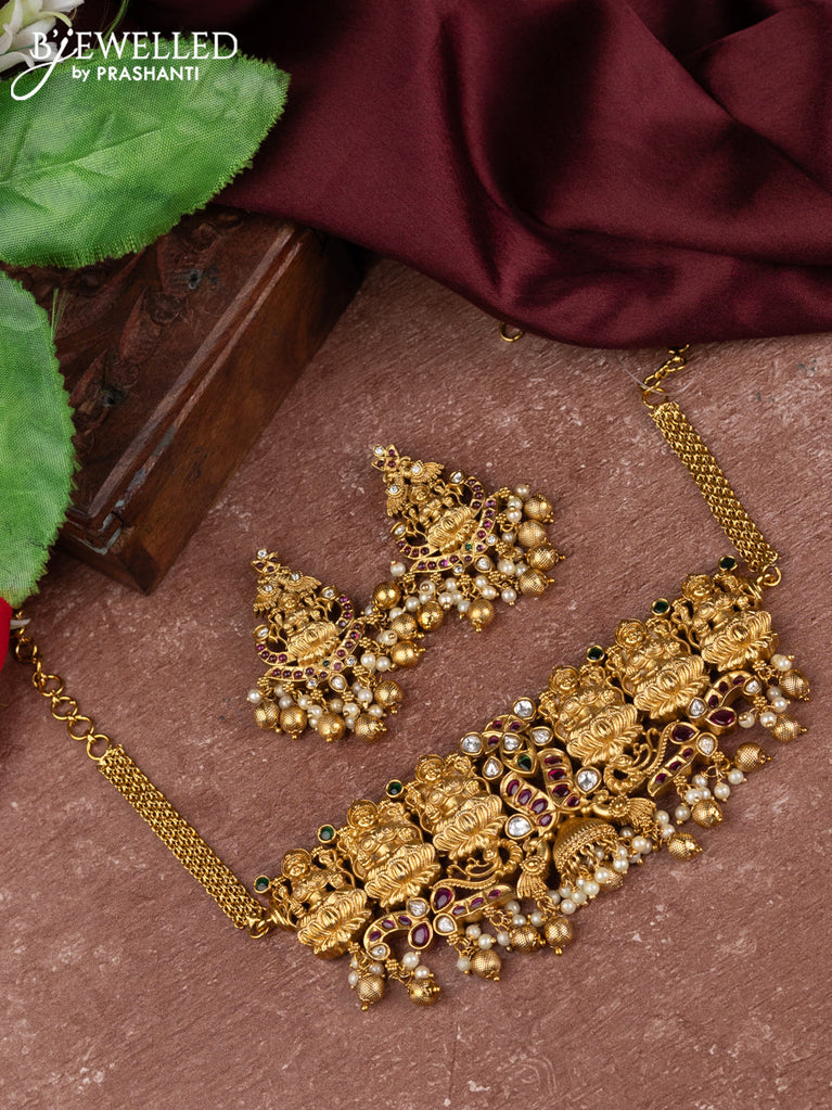 Antique choker with lakshmi design kemp & kundan stones and pearl & golden beads hangings