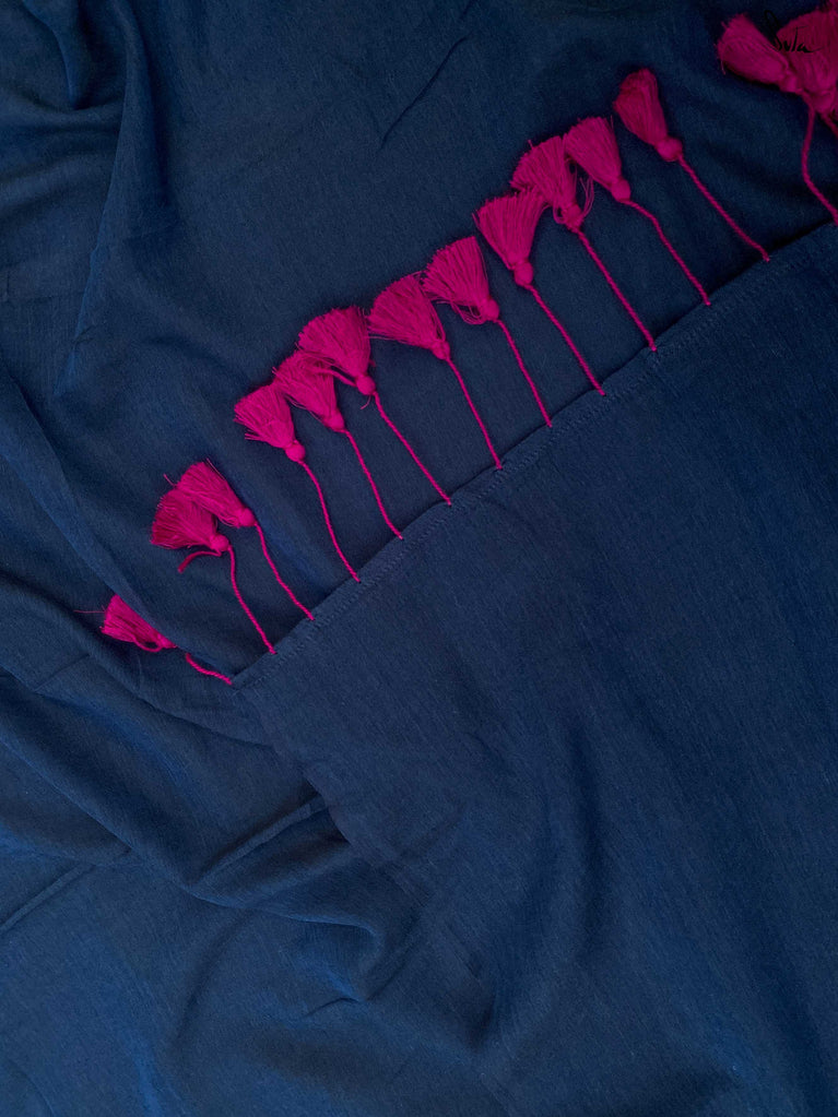 This gorgeous made-in-heaven mul cotton saree in purple with pink tassels and beautiful Ghicha lines on the pallu and zari border is enough in itself to make a stunning statement!